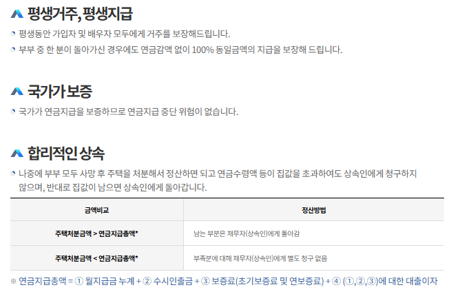 - 국가가 보증: 한국주택금융공사가 운영하므로 연금 지급이 중단될 걱정이 없습니다.
